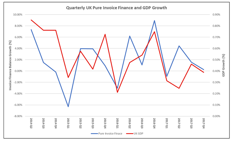 The UK economy grew by 0.39% in the final quarter of 2017 and 1.42% over the course of the year, a slower rate of growth than Q3 2017 (0.46%) and across 2016 (1.99%). Similarly, the increasing balance of invoice finance has experienced two consecutive quarters of deceleration from 4.46% and 1.57% in Q3 and Q3 2017 respectively, and substantially down on the 8.94% growth generated in Q4 2016.